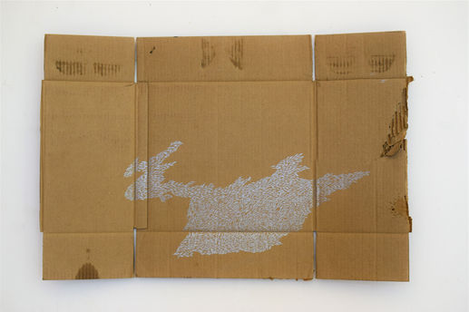 The images represent people neglected from society. The reclining figure depicting a homeless man, neglected, but the beauty of survival, the imaginary floor of golden carpet, on the right, cartons have flourishing a pattern, motifs or form, could be something natural or surreal.